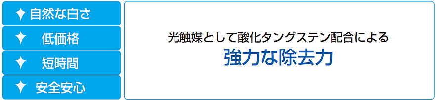 ホワイトニングジェルに含まれる酸化タングステンは、汚れを浮かして自動洗浄する性質や除菌、臭いを消す効果がございます。