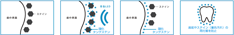 『酸化タングステン』配合のオリジナルのホワイトニングジェルを歯に塗布し、紫外線の出ない最先端LED 機器を照射するだけで従来のホワイトニングよりもさらに着色汚れを徹底除去し、『透明感のあるクリアな白いピカピカな歯』を可能に致しました。