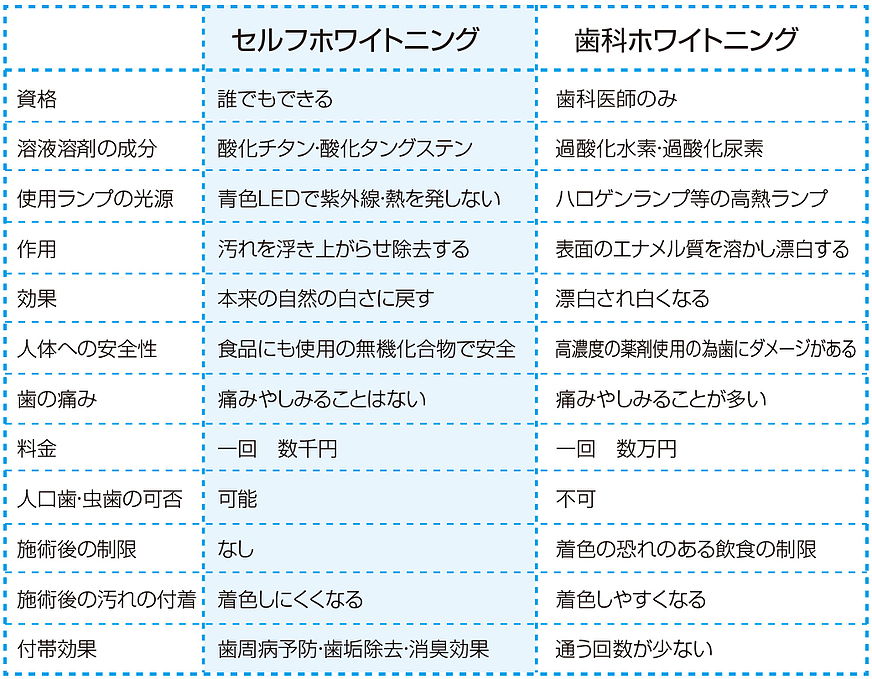 セルフホワイトニングは、お口の中の診察や治療等の医療行為を行わないため、歯医者さんで行うホワイトニングとは、別ものとなります。